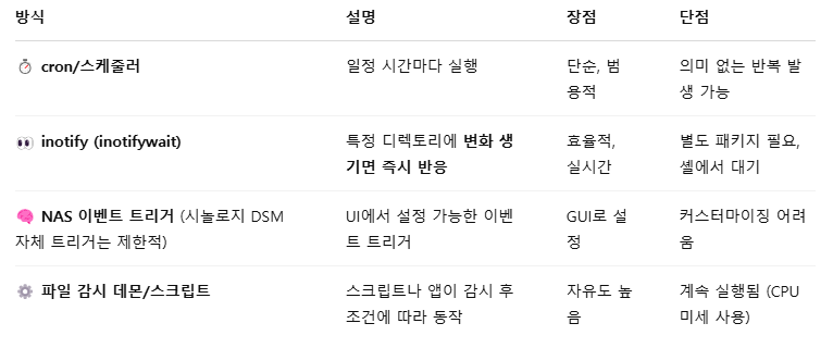 여기서 나는 inotify 를 선택했다. 특정 폴더에 변화가 생기면 즉시 반응하는 시스템. 내가 원하던 방식이다. 하지만 별도 패키지가 필요하다. 기본적으로 시놀로지에서는 설치가 안 되어 있어서 설치를 해야 한다.