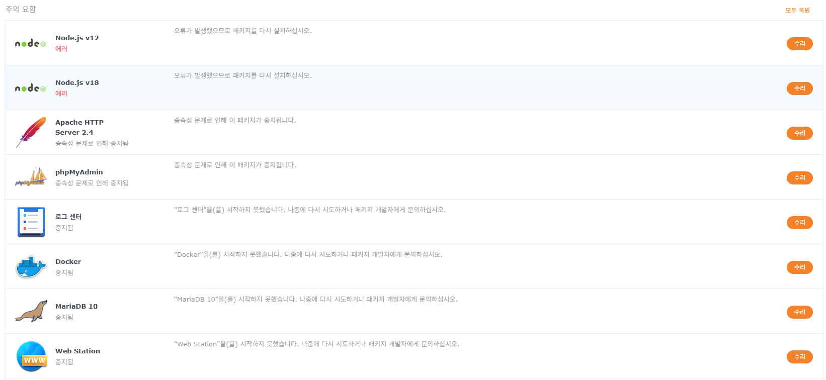 문제는 여기서 발생했다. Synology DSM에 접속하자 화면이 뭔가 이상했다. 패키지 센터에 들어가 보니 이런 오류가 발생했다.